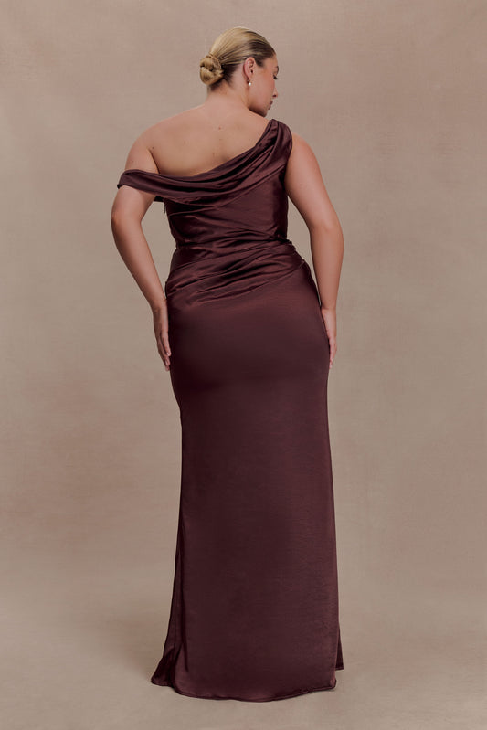 Dalia Off Shoulder Satin Maxi Dress - Dark Chocolate