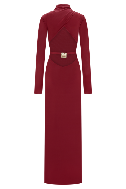 Mattea Slinky And Mesh Maxi Dress With Scarf - Burgundy