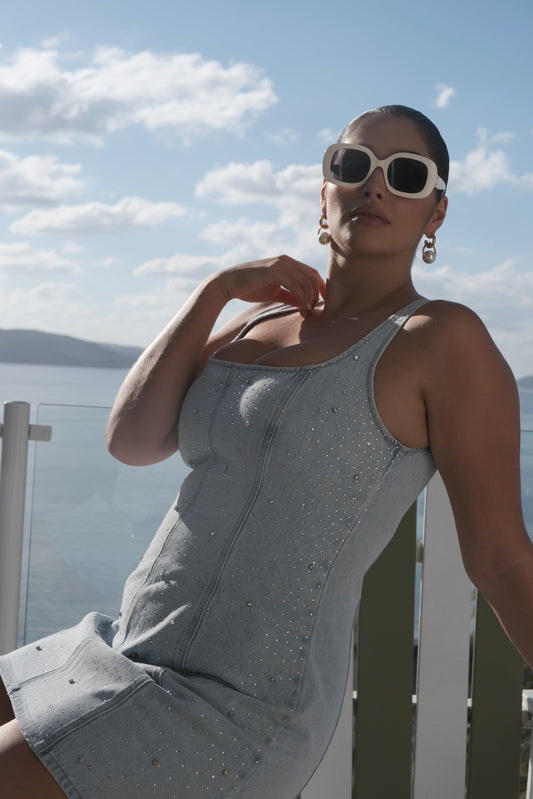 Ebony Embroidered Denim Mini Dress - Cream