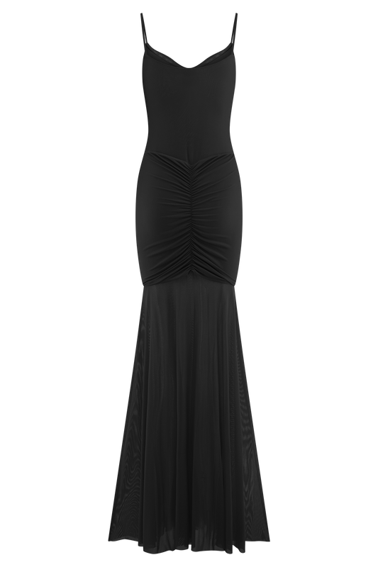 Slinky And Mesh Maxi Dress With Scarf - Black