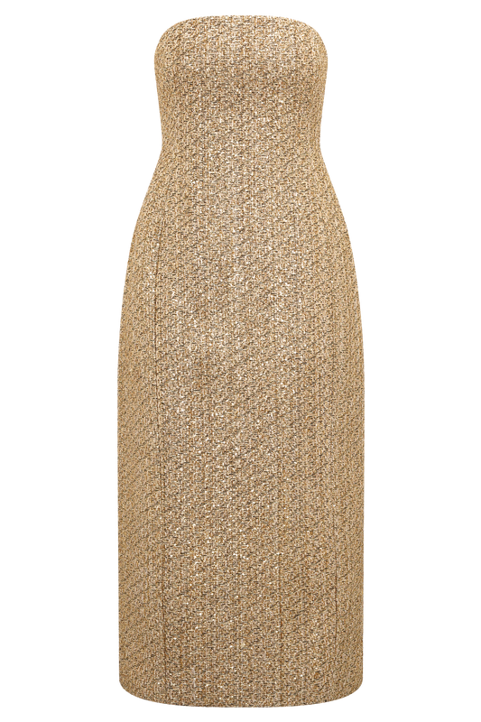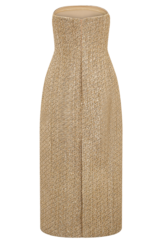 Regular price $235Unit price / perGala Strapless Tweed Midi Dress - Gold