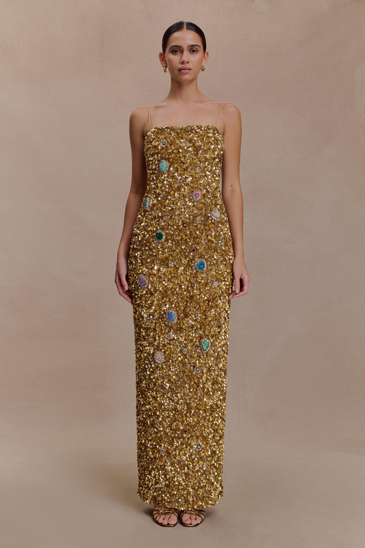 Deanna Long Sleeve Diamante Maxi Dress - Gold