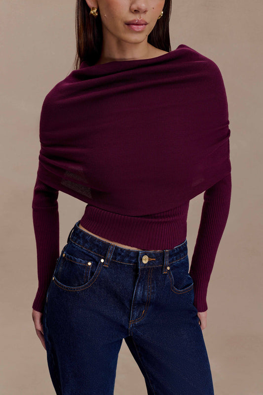 Asymetrical Cashmere Blend Long Sleeve Knit Top - Plum