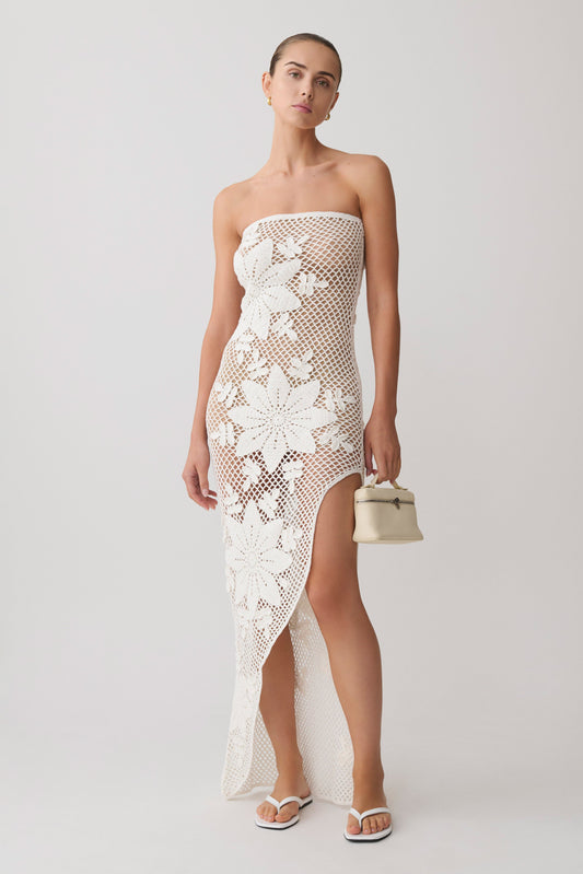 Mandie Hand Crochet Asymmetrical Maxi Dress - White