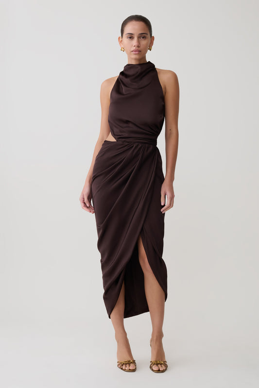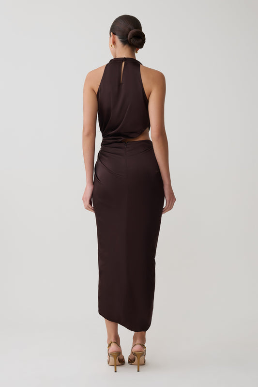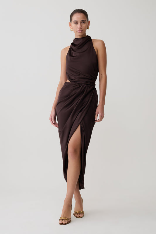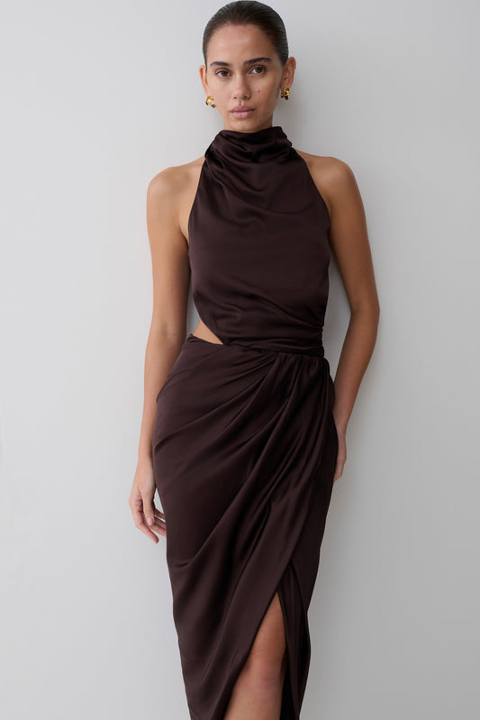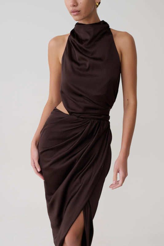 Aveline Draped Halter Midi Dress - Dark Chocolate