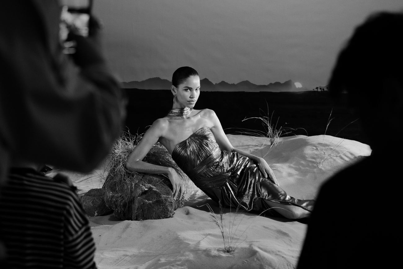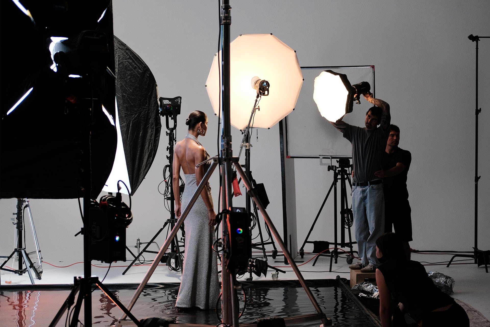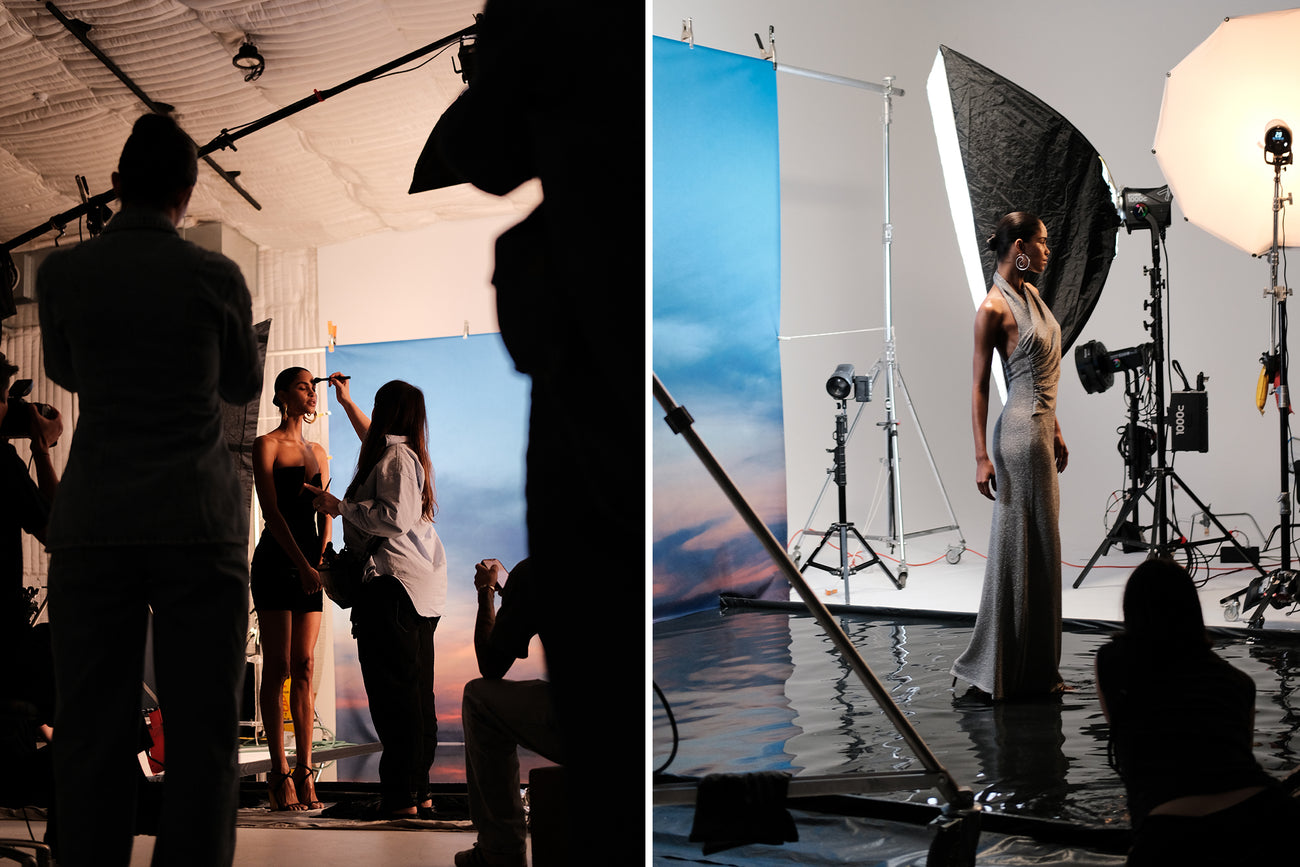 As I arrived at the location, I walked into a huge white room with incredibly high ceilings. Inside this room, I found a space buzzing with energy. Stylists, photographers, videographers, models, assistants - everyone had a role and moved with purpose. The first thing that caught my eye was the striking model, completely in her element, glowing in golden light and radiating confidence.