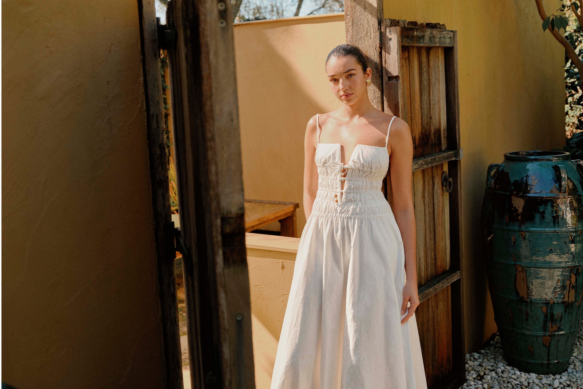 Think of it as your bridal wardrobe’s graceful transition. White and strapless with delicate broderie detailing for those in-between moments. Minis, midis, and maxis to take you from the beach to dinner to lounging on the balcony. Relaxed when it needs to be, elevated when the mood shifts.