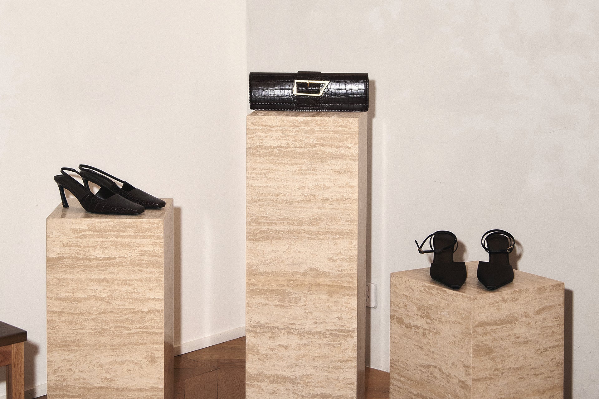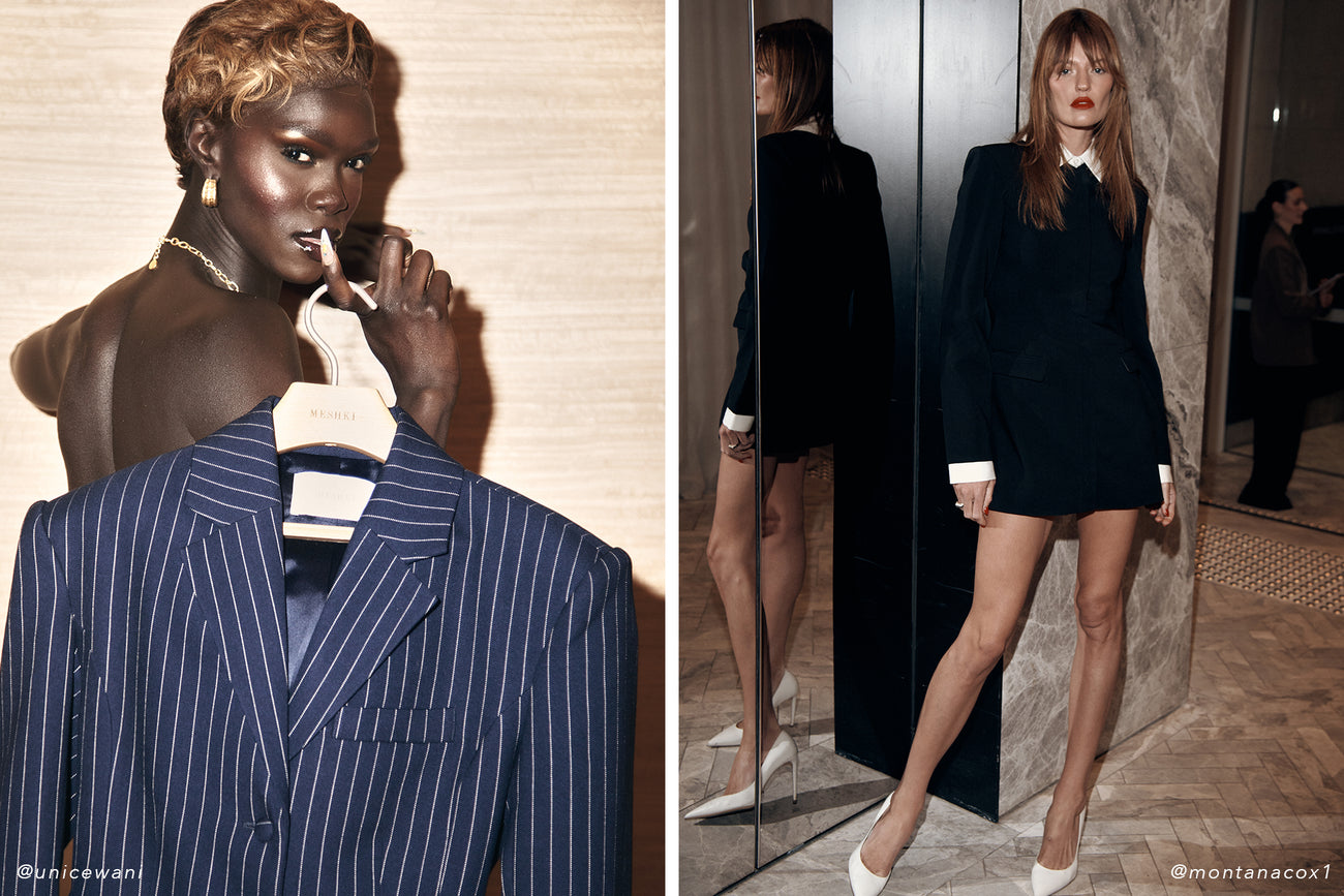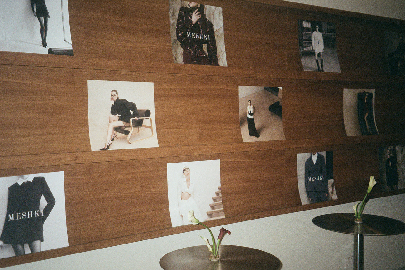 The venue was transformed to reflect the world of MESHKI: chic, timeless, elevated, with just the right touch of cool restraint. Sculptural racks were meticulously merchandised with the hero pieces of the collection. Statement furniture, branded decor touchpoints, and curated lighting created a space that mirrored the collection’s sharp sophistication. A DJ set the rhythm of the night, while a gifting station offered a parting piece of MESHKI to every guest.