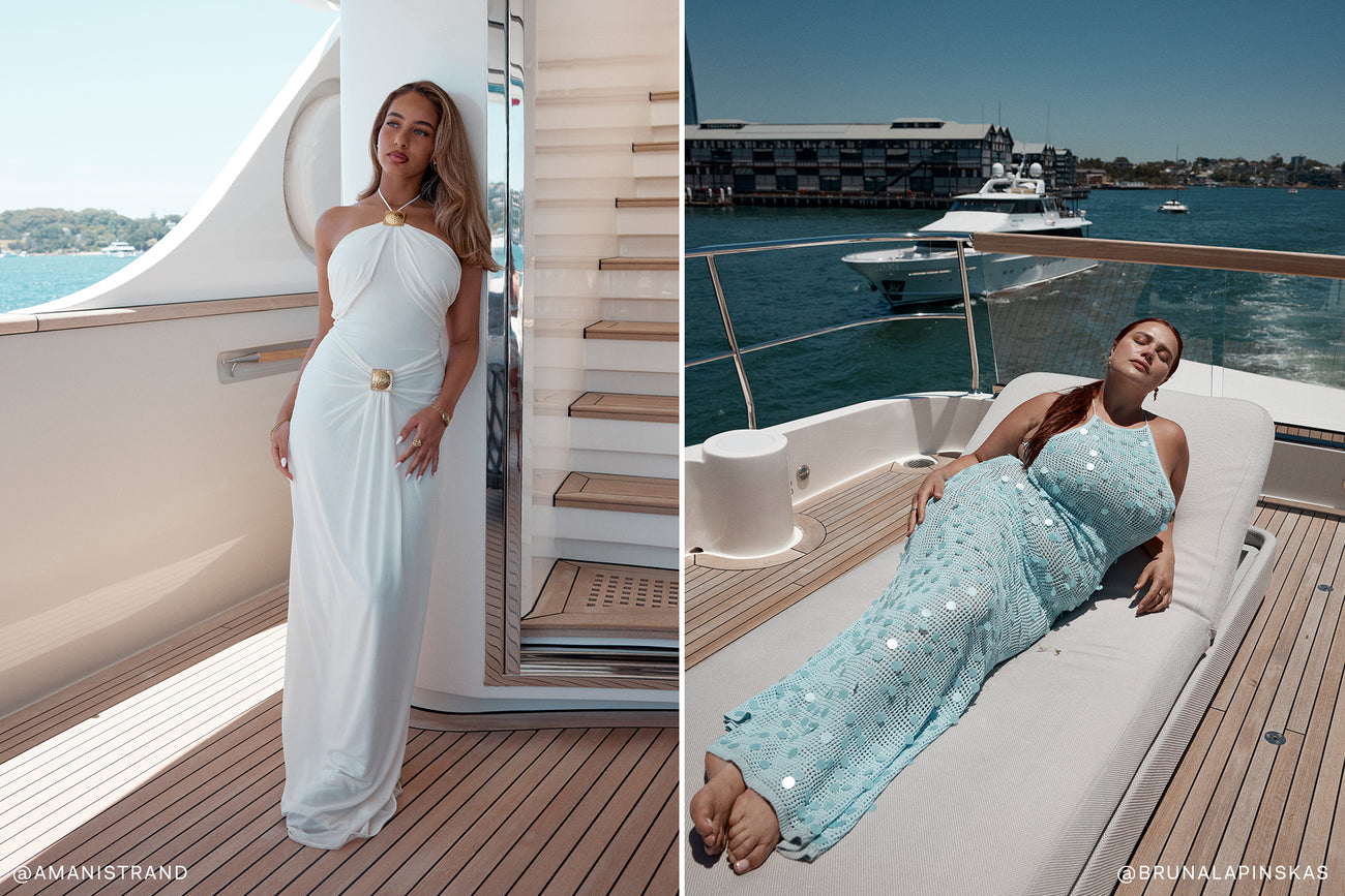 Upon arrival, guests were welcomed with refreshing summer spritzes and thoughtfully curated yacht-day essentials. Sunscreen, swimwear, towels and water bottles were on hand, ensuring every detail was considered for a seamless day on the water. The yacht itself was fully transformed into a floating reflection of the MESHKI world, adorned with soft florals and showcasing pieces from our latest resort collection, available for guests to try on and experience throughout the day.