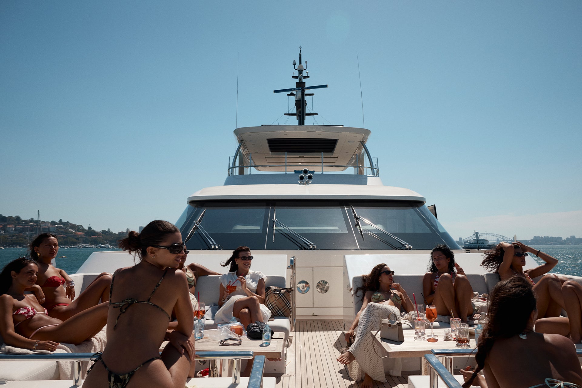 After anchoring just off Rose Bay, the day unfolded naturally. Inflatables were released into the water, canapés began to circulate, including caviar bumps enjoyed best at sea and music filled the air. Over the next few hours, guests moved freely between moments: lounging at the bow in MESHKI swim, paddling through the water, dancing on the top deck to our curated playlist, or simply reconnecting over a drink with familiar faces and the MESHKI team.