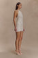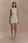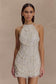 The ADORA Pearl Halter Mini Dress is your invitation to stand out. Designed with a flattering halter neckline and a daring low open back, this mini silhouette draws attention from every angle. Its scalloped, asymmetrical hem adds movement and intrigue, while hand-beaded pearl embellishments shimmer against sequin lace fabrication for a look that’s nothing short of luminous. Fully lined for comfort, this piece is made to dazzle—from candlelit dinners to champagne-soaked celebrations.