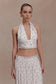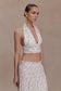 The AMARIS Sleeveless Plisse Halter Top brings soft movement to a sleek, body-contouring silhouette. Designed with a plunging V neckline and an elasticated halter neckband, it frames the décolletage with effortless elegance while offering a secure, comfortable fit. Fine plissé pleating adds texture and dimension through the fitted bodycon shape, enhanced by full lining for a smooth, refined finish. Completed with an invisible zip for clean closure, this top is a modern statement in fluid sophistication — perfectly styled alone or paired with the matching skirt.