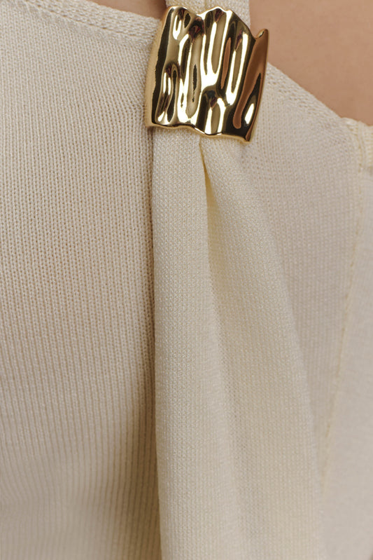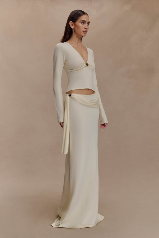 The BOWIE Low Rise Knit Maxi Skirt brings a fresh twist to relaxed elegance. Designed with a mid-rise waistline and comfortable elastic waistband, it features a gathered overlay detail with sleek hardware and a draped side sash for added movement. Cut to a maxi length and left unlined for a soft, fluid feel, this skirt is the perfect foundation for effortless day-to-night styling.