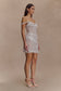 The CONNIE Beaded Bodycon Mini Dress is crafted for statement-making elegance. Designed with a V-detail neckline and versatile multi-wear straps—styled on or off the shoulder—it offers endless ways to make it your own. Gathering at the bust adds softness, while a boned waist panel sculpts the silhouette above a draped mini skirt. Cut from pearl-beaded fabrication with a semi-sheer finish and fully lined for comfort, Connie is your show-stopping choice for evenings that call for shimmer and sophistication.