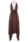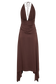 The CYRA Plunge Satin Midi Dress blends soft movement with sculpted detail. Designed with a deep V halter neckline that ties elegantly at the back, it frames the décolletage while revealing an open back. A twisted waist panel defines the silhouette, drawing the eye before falling into a softly flowing skirt. The handkerchief hemline adds fluid motion and dimension, finished in a long midi length for an effortlessly refined look. Fully lined and secured with a discreet side zip, this piece balances lightness with modern elegance.
