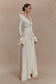 The ELECTRA Slinky Lace Maxi Dress blends sultry detail with fluid design. Featuring a deep V lace neckline and fitted silhouette, this dress hugs the body while lace cut-outs add delicate intrigue. A cascading front-side tie drape brings graceful movement, while flared layered sleeves evoke a sense of vintage romance. Partially lined for contrast and comfort, this dress is designed to turn heads—whether it’s a moonlit dinner or a statement-making soirée.