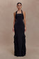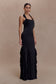 The ETTA Ruffle Slinky Maxi Dress is designed to contour the body while moving with effortless grace. Featuring a halter neckline with an adjustable back neck tie, it frames the décolletage with soft elegance. Crafted in slinky fabrication, the fitted bodycon silhouette is elevated with cascading ruffle detailing through the skirt, adding texture and fluidity to the maxi-length design. Fully lined for a smooth, confident finish, this dress delivers romantic impact with modern refinement.