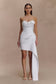 The EVIANNA Strapless Gathered Mini Dress blends feminine detailing with statement structure. Featuring a sweetheart neckline and an internal corset, the fitted bodice is designed to shape and support with precision—enhanced further by a secure waist stay. A dramatic rose detail blooms at the waist, complemented by a cascading side drape that adds sculptural movement and couture-inspired flair. Fully lined and finished with an invisible zip, Evianna is your moment-maker—flawless for cocktail hour, celebrations, and everything in between.