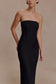 The GEMMA Strapless Mesh Maxi Dress blends clean lines with sculptural detailing for a modern, feminine silhouette. Designed with a straight strapless neckline and curved waist seam, it accentuates the form with subtle precision. The internal boning and built-in bodysuit provide support and structure, while the mesh overlay adds soft texture and depth. Fully lined for comfort and finished with a snap button gusset closure, this fitted bodycon silhouette redefines minimal glamour with a refined edge.