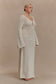 The KAYLEIGH Crochet Maxi Dress is designed to captivate in every detail. Featuring a deep V-neckline and rounded V-back, this maxi is elevated with two front keyhole cut-outs secured by signature MESHKI gold bar hardware. Long flared sleeves and a raw, floor-length hem create dramatic movement, while the sheer crochet knit offers a soft, breathable finish. Crafted in a cotton-acrylic blend, it delivers effortless elegance with a touch of statement shine. Whether for festivals, holiday escapes, or sunset dinners, this dress is made for standout moments.