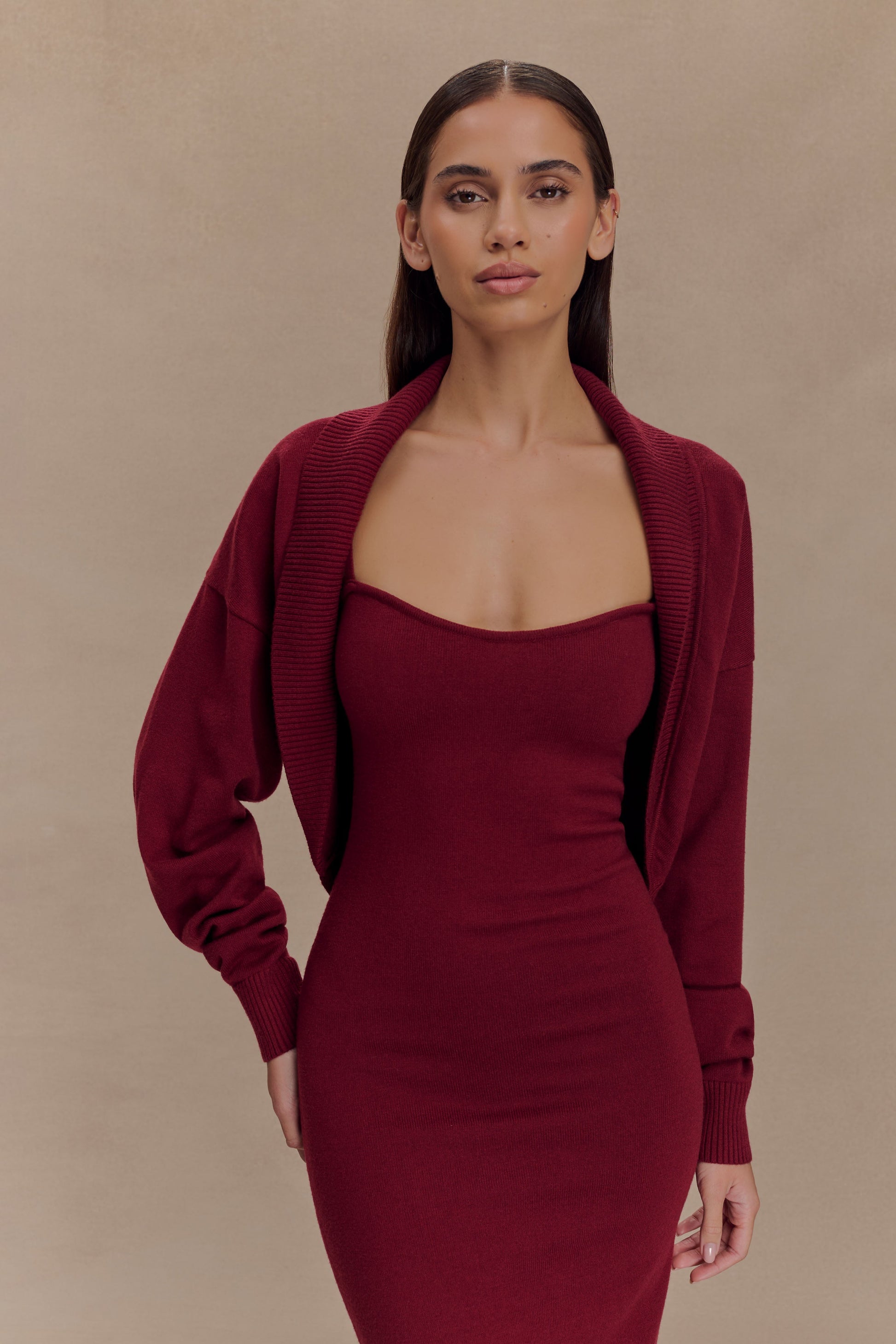Meet the KINGSTON Knit Maxi Dress — a sleek, sculpted essential with a twist. Designed with slender straps and a straight neckline, this bodycon silhouette contours the body while offering effortless movement with a back vent and breathable, unlined finish. The removable bolero adds versatility, featuring slouchy-fit sleeves and a ribbed neckline for a touch of relaxed edge. Whether styled together or worn solo, Kingston is your go-to for easy sophistication with a modern mood.
