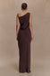 The LORIEANNE Draped Maxi Dress is a fluid take on evening elegance. Designed with an asymmetric neckline and a twisted single strap, this silhouette is elevated by artfully draped fabric that flows across the front and back. A subtle invisible zip maintains a clean, seamless finish, while the maxi length adds a sense of refined drama. Perfect for events where understated impact makes the loudest statement.