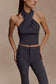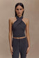 The MARION Cross Over Top is a modern statement piece with a sleek, cropped silhouette. Featuring a cross halter neckline that fastens with a back button closure, it frames the shoulders with bold simplicity. Fully lined for a smooth fit and finished with an exposed centre back zip, this top pairs effortlessly with tailored trousers or its coordinating bottoms for an elevated set moment.