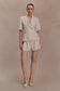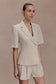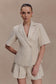 The MARTINE Short Sleeve Linen Top redefines warm-weather tailoring with clean lines and considered detail. Designed with an asymmetric lapel neckline, it brings a contemporary edge to a classic silhouette. Short sleeves keep the look effortless, while a button-front closure with an internal button ensures a seamless, polished finish. Fully lined for structure and comfort, this top is completed with a front welt pocket for subtle tailoring appeal. Elevated yet easy, this top pairs perfectly with the matching shorts or stands confidently on its own.