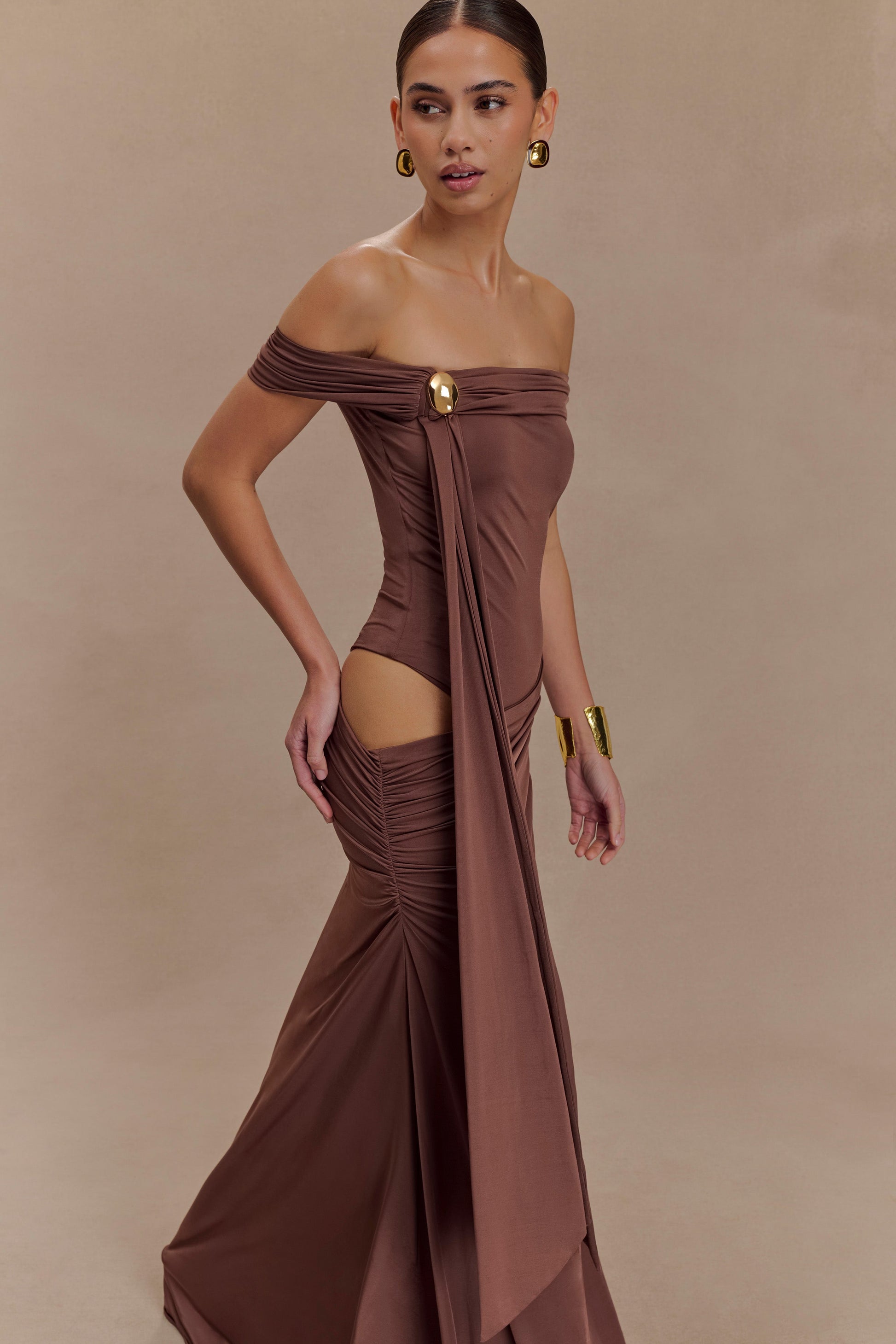 The OLIVER Slinky Maxi Dress is an elevated take on occasion dressing with just the right amount of edge. Designed with an off-the-shoulder neckline and gathered shoulder overlay, this silhouette flatters with a fitted bodice and soft A-line drape. Front hardware and sash detailing create a modern focal point, while the hip cutout and cascading skirt bring bold femininity to life. Finished in a slinky fabrication with a maxi length, this dress is your go-to for making an unforgettable entrance.