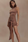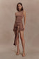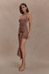 The SINEAD Slinky Mini Dress With Hardware pairs fluid draping with sharp, polished detail. Designed with a clean boat neckline, this dress features a sculptural hardware accent that anchors the front hip tie overlay for a flattering, asymmetric effect. Gathered skirt detailing enhances the bodycon fit, creating soft dimension through the silhouette. Partially lined for comfort and cut to a confident mini length, this dress delivers a refined, modern take on after-dark dressing.