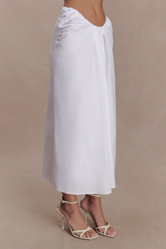 The TALIA Chiffon And Linen Halter Top blends fluid softness with tailored structure. Designed with a halterneck in gathered chiffon, it features delicately pleated bust cups that add dimension and shape. A contrasting linen-blend bodice panel introduces subtle structure, balancing the airy fabrication through the neckline. Finished with an adjustable hook-and-bar strap at the back and a centre-back open-ended zipper with an internal placket and button, this cropped silhouette feels considered and precise. Light yet defined, this top is made to elevate warm-weather moments with effortless intent.