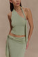 The XANTHIA Knit Halter Top brings modern detailing to a sleek, minimalist silhouette. Designed with an asymmetrical halter neckline, it features side hardware and a draped sash for a touch of movement. The open back adds an alluring finish, while the unlined knit fabrication keeps this top lightweight and versatile—perfect for pairing with tailored pants, a statement skirt, or its coordinating bottom for a complete set.